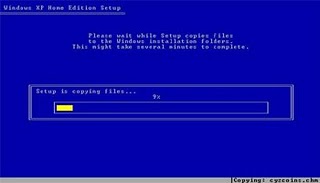 14. Setelah proses format selesai, komputer akan melakukan transfer data dari CD master ke hardisk komputer, tepatnya pada drive C:. Prosesnya seperti pada gambar dibawah.